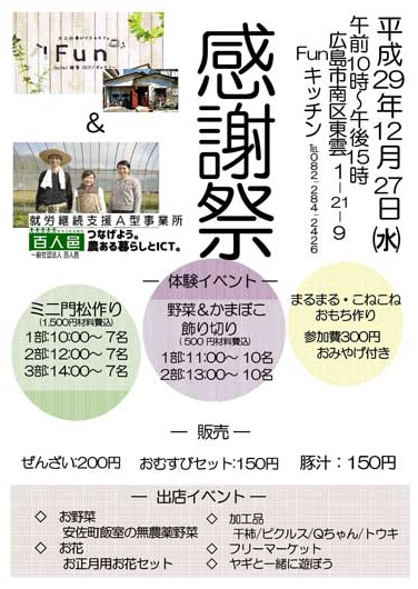 本日12月27日は、南区東雲にある大工仕事ができるカフェ Fun(ファン)さんにて、感謝祭を協同開催しております!